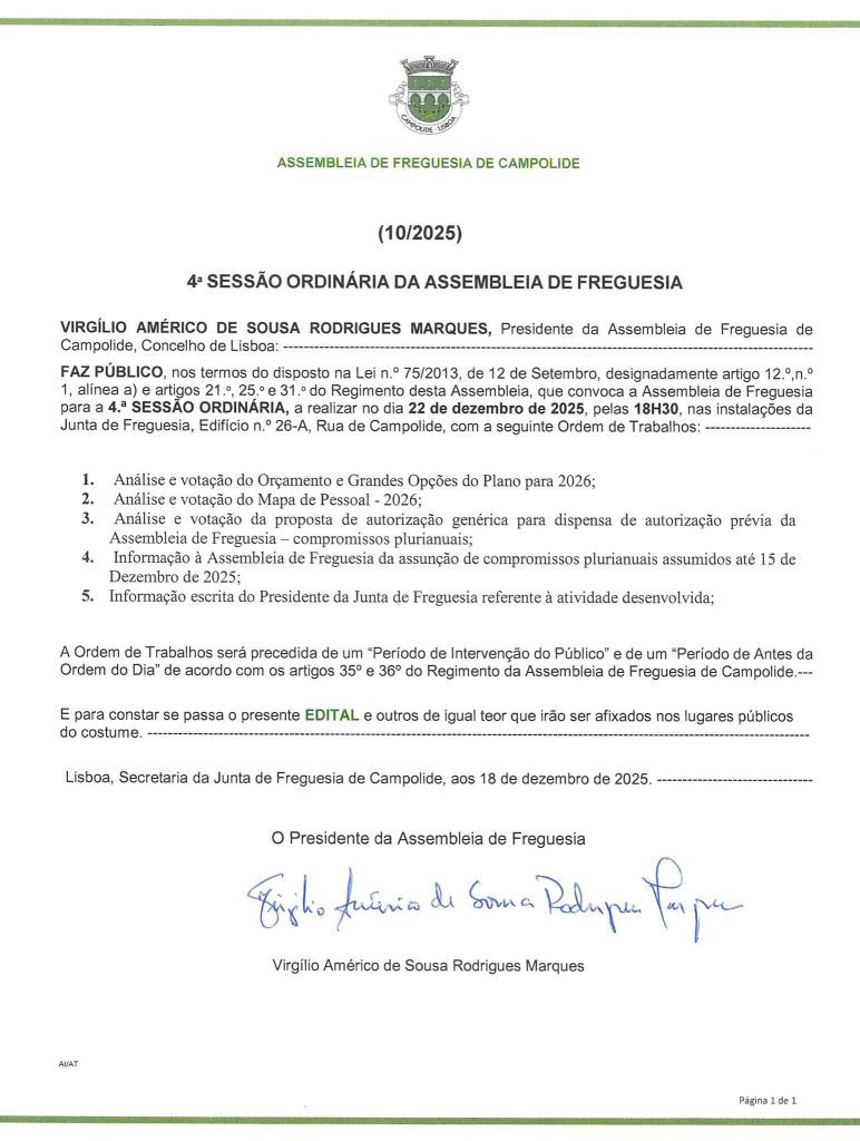Edital | 4ª sessão ordinária da Assembleia de Freguesia (10/2025) – Ordem de Trabalhos