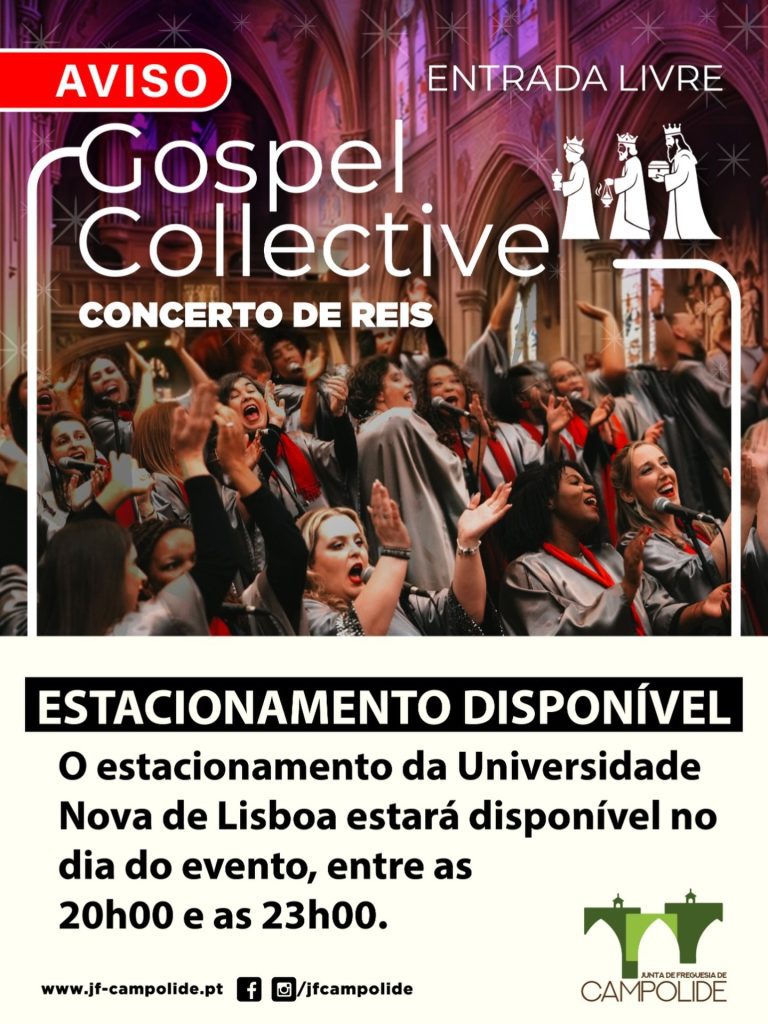 Para maior comodidade do público, informamos que o parque de estacionamento da Universidade Nova de Lisboa estará disponível no dia do evento, entre as 20h00 e as 23h00, facilitando o acesso ao Concerto de Reis | Gospel Collective.