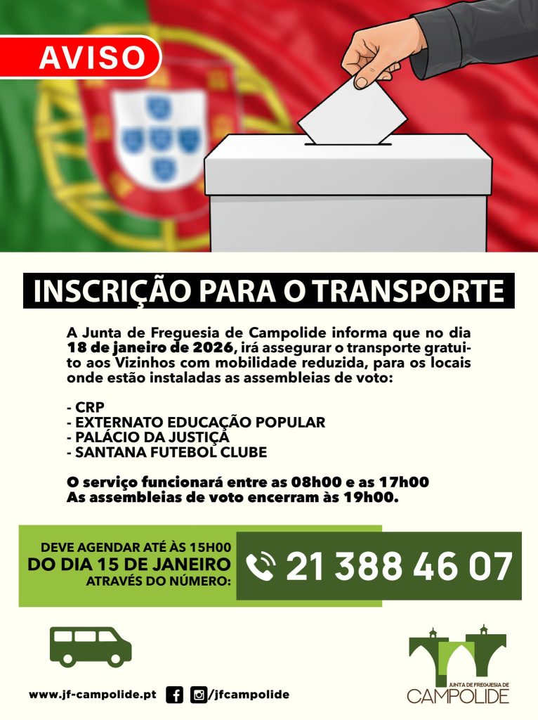 No próximo dia 18 de janeiro de 2026, data das Eleições Presidenciais, a Junta de Freguesia de Campolide disponibiliza transporte gratuito para Vizinhos e Vizinhas com mobilidade reduzida, assegurando um acesso cómodo e seguro ao exercício do direito de voto.