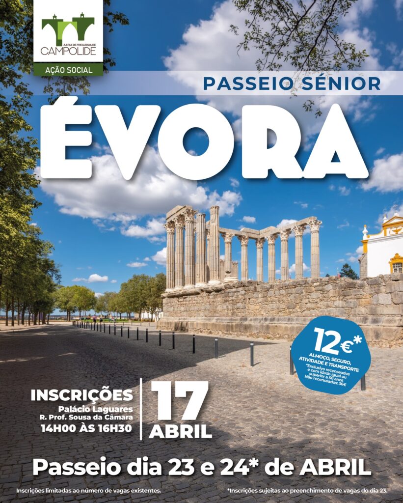 A Junta de Freguesia de Campolide convida-o a participar num passeio a Évora, uma oportunidade para conviver, descobrir património e desfrutar de um dia diferente!