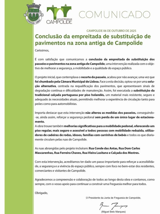 Mensagens do Presidente da JFC, sobre assuntos de interesse dos Vizinhos e Vizinhas | Conclusão da empreitada de substituição de pavimentos na zona antiga de Campolide