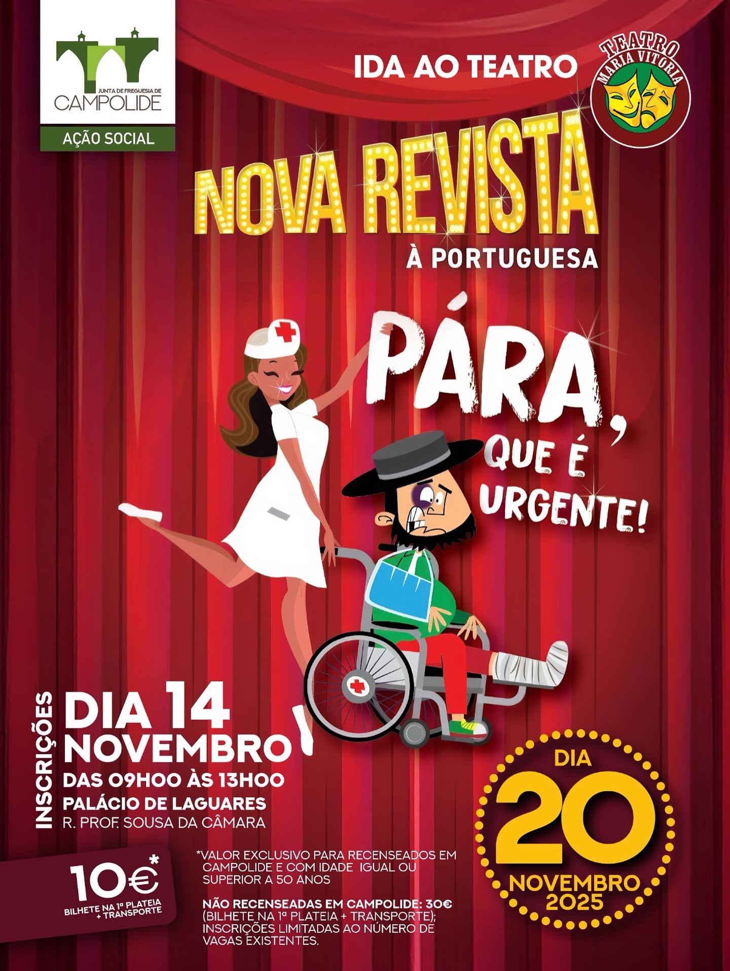 A Junta de Freguesia de Campolide convida-o(a) para uma noite inesquecível no Teatro Maria Vitória com o espetáculo “PÁRA, QUE É URGENTE!”, no dia 20 de novembro!