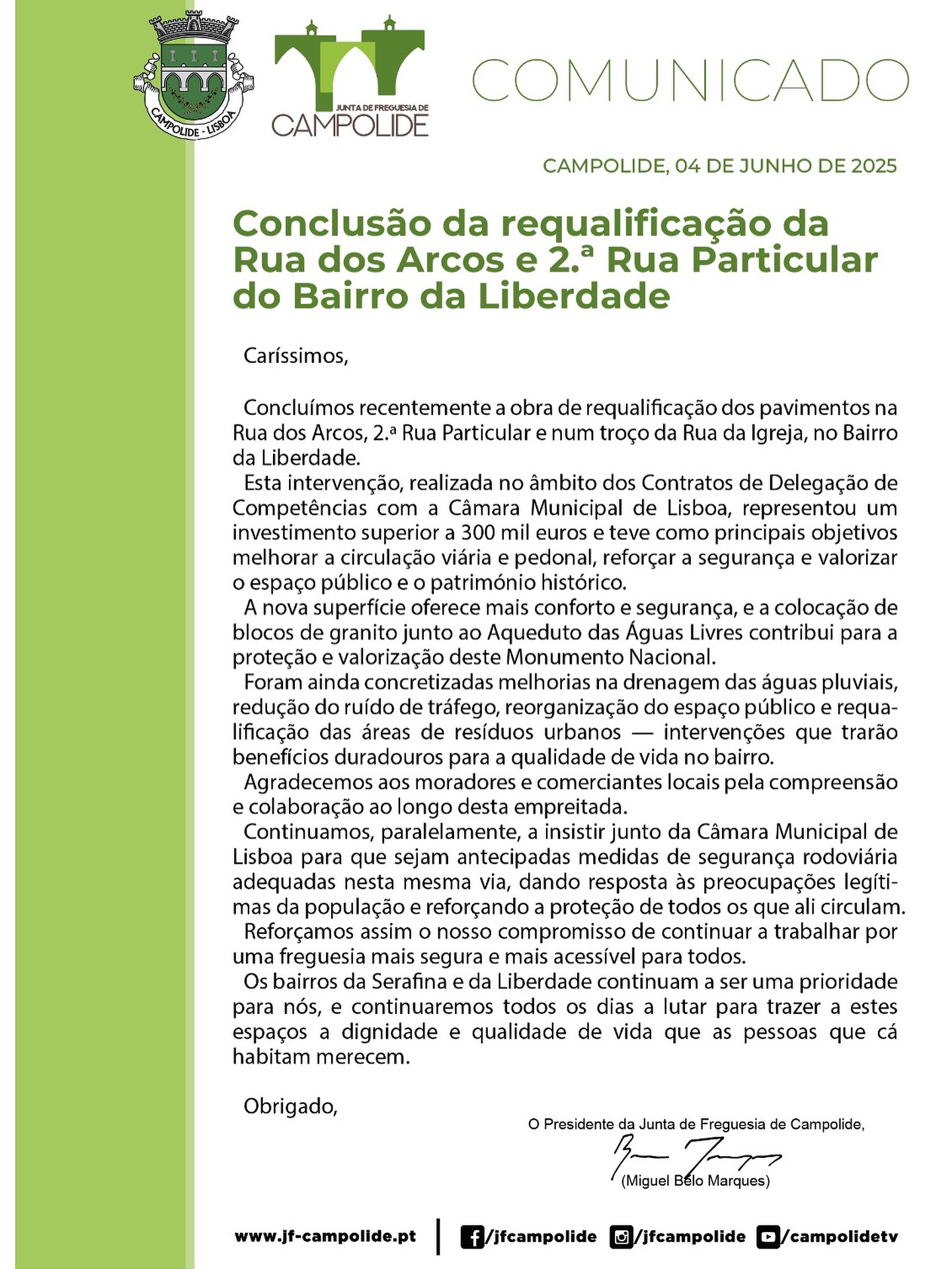 Mensagens do Presidente da JFC, sobre assuntos de interesse dos Vizinhos e Vizinhas | Conclusão da empreitada de substituição de pavimentos na zona antiga de Campolide